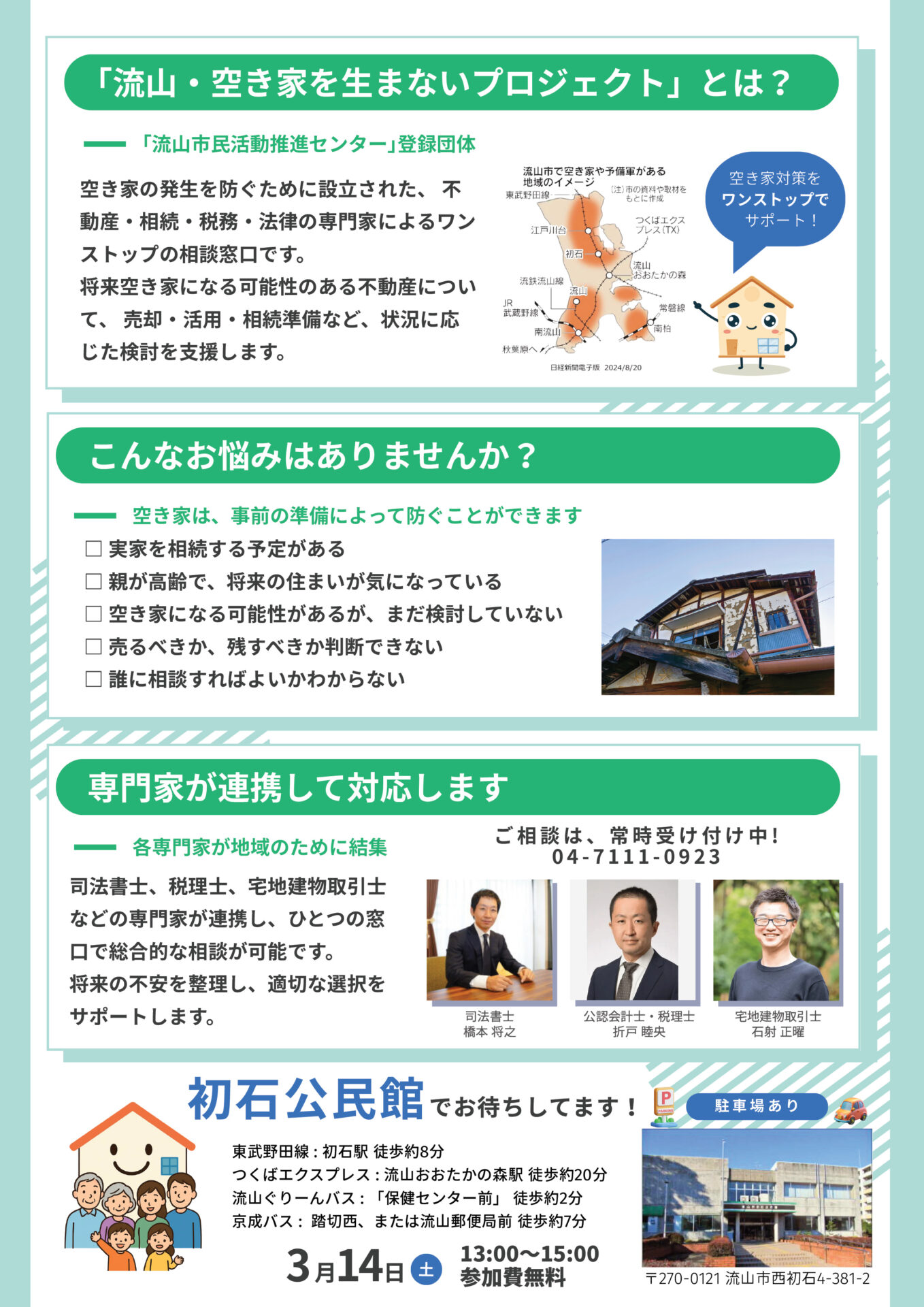 このたび「流山・空き家を生まないプロジェクト」では、参加無料の勉強会&相談会を開催します。専門家の話を聞き、必要に応じて個別相談もできる機会です。